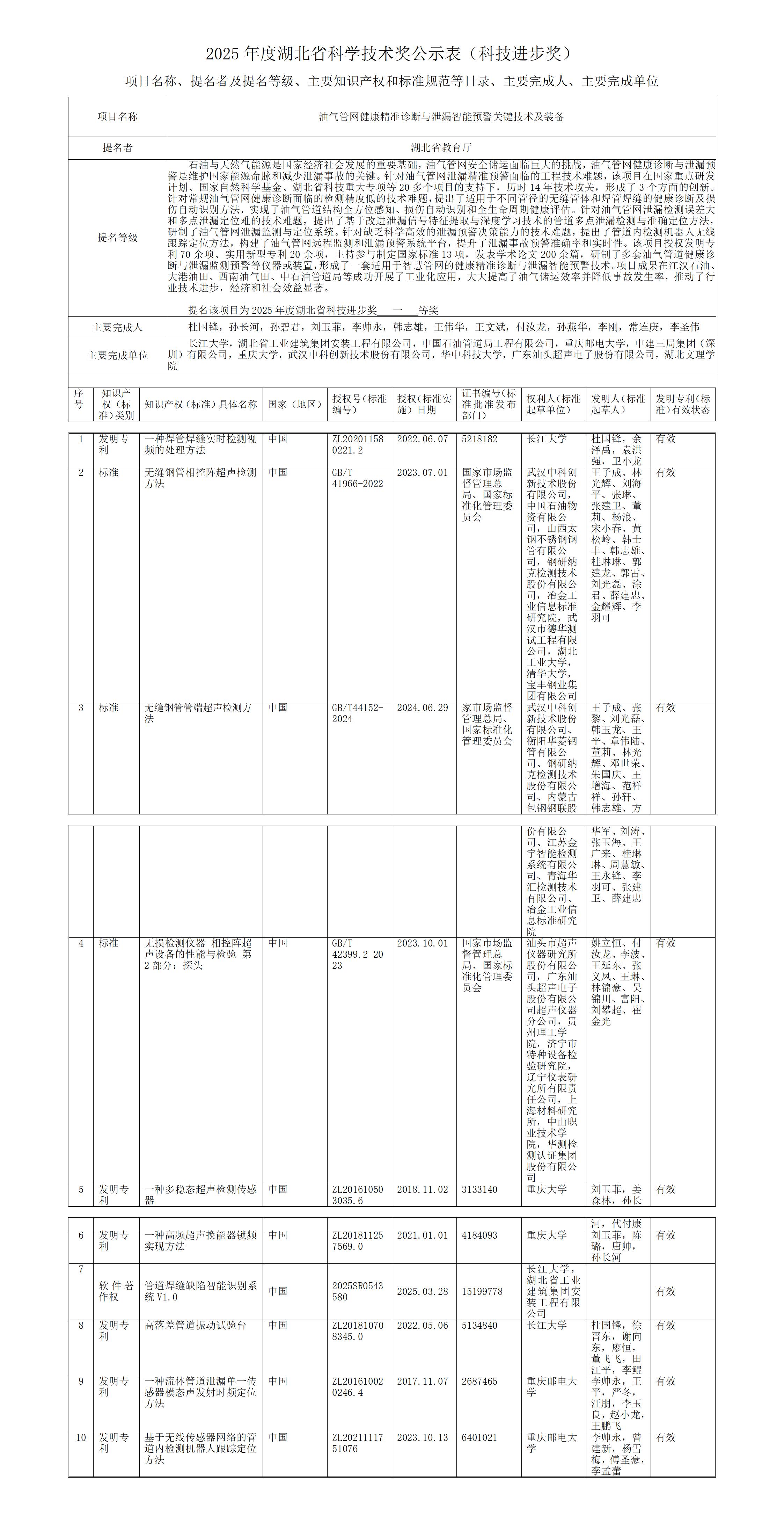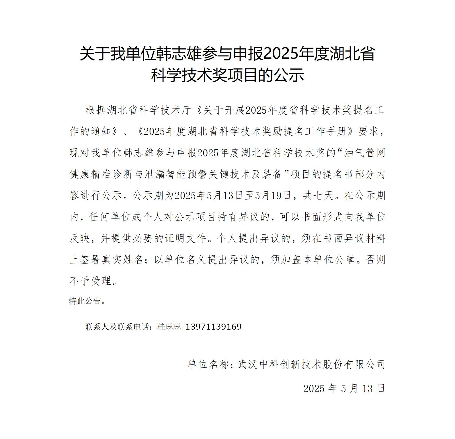 关于我单位韩志雄参与申报2025年度湖北省 科学技术奖项目的公示